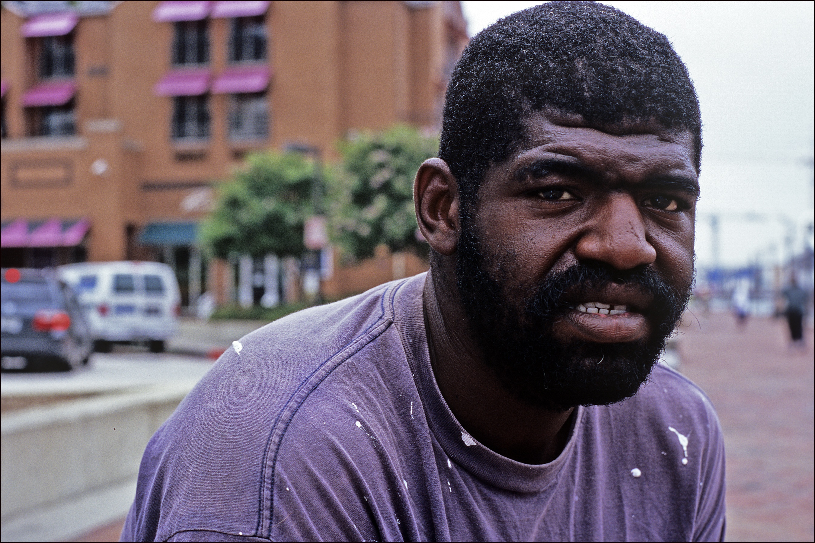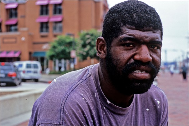 “They call me the Godfather of the Inner Harbor. I never leave the harbor, here twenty-four seven.” Lonnie was bright and articulate. He said he had a degree in psychology. “The [homeless] life-style itself is addictive. I have no responsibilities, no bills, no commitments. It’s the life I’ve chosen. It gives me time to do what I want. My main thing is books.” Lonnie said he pulls books out of the dumpster behind Barnes and Noble. “Reading is my drug of choice. It changes your mind, takes you other places, a different reality. And it’s legal!” He said he chose his homeless life and that it agreed with him. “That’s what this great country is all about. Choices. On the other hand, America is all about getting things. It’s about what you have in order to be somebody. But that’s all materialism and temporal. Until the time comes when I am no longer happy with what I do, I am happy. When that time comes, I’ll change.”