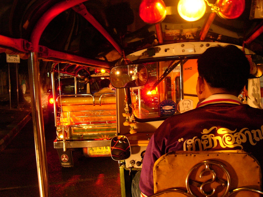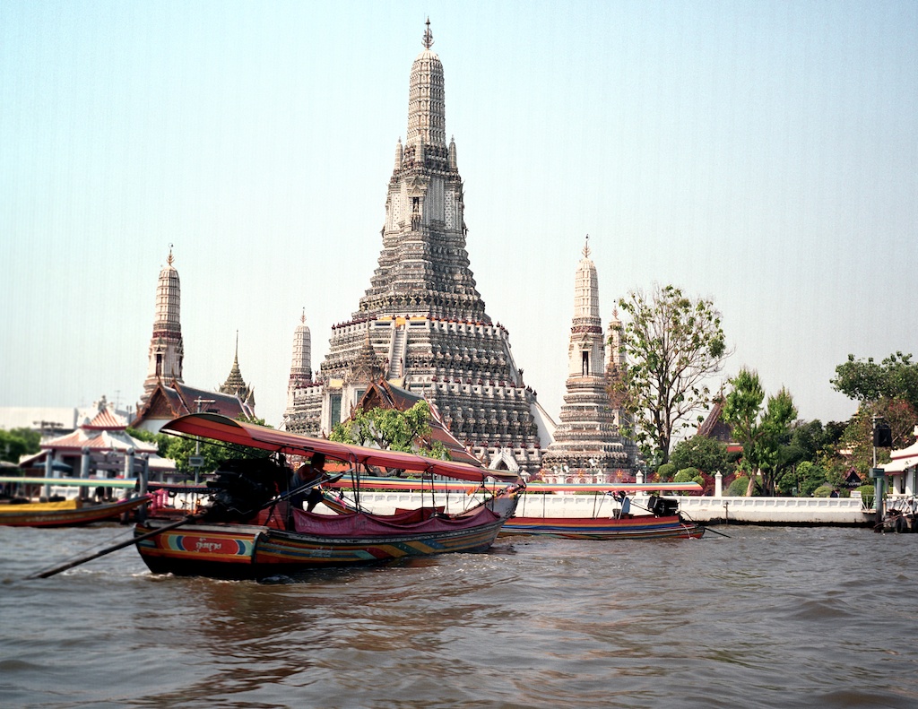 Bucking the hint of intimidation, as Bangkok certainly is to this traveler, and getting a full night–and some of the day’s–sleep, I leave the Oriental and walk the block to the dock where I hire a water taxi–10 Baht (about 20 cents)–and head up the Mae Nam Chao Phraya, switching boats mid-river (neat trick!) and on to the Wat Ra Kang dock, setting out on my most favorite of things: aimlessly walking the streets of a new city, camera in hand. At day’s end, after making my way back via land taxi(s) and rickshaw, I enjoying a killer meal of Pad Thai (as you might expect) then settle in for the night, as the rest of the city, amid serious grid-lock of taxis, motor bikes and rickshaws, marches to decadence (which has been offered, though declined), lights, and clammer. I call it a day.